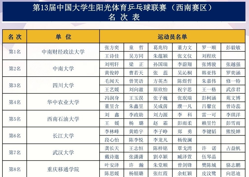 喜报!我校乒乓球队在第13届全国大学生阳光体育乒乓球联赛(西南赛区)中勇夺冠军
