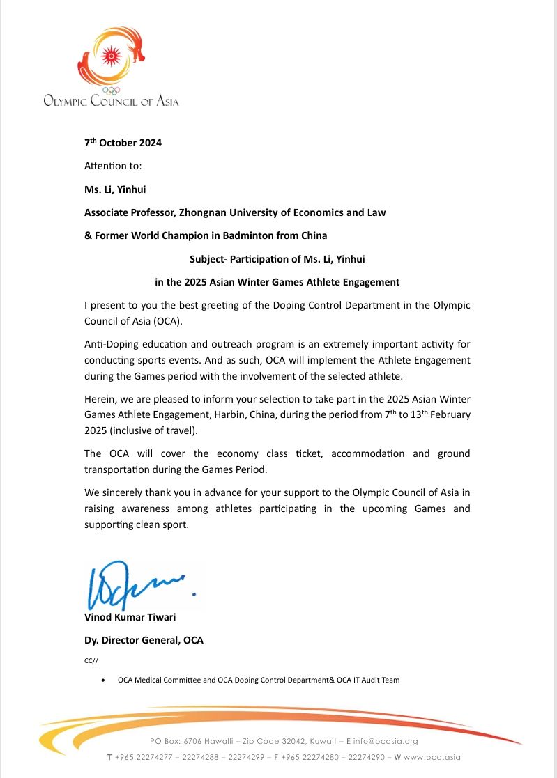 (通讯员 迟文戈)哈尔滨2025年第九届亚洲冬季运动会于2025年2月7日至2月14日举行,是继2022年北京冬奥会后中国举办的又一重大综合性国际冰雪运动盛会。本届亚冬会以“冰雪同梦,亚洲同心”为口号,来自亚洲34个国家和地区的1200余名运动员报名参赛。我部教师李茵晖受亚洲奥林匹克理事会(OCA)邀请,作为OCA技术官员(反兴奋剂精英运动员代表),参加此次运动盛会。