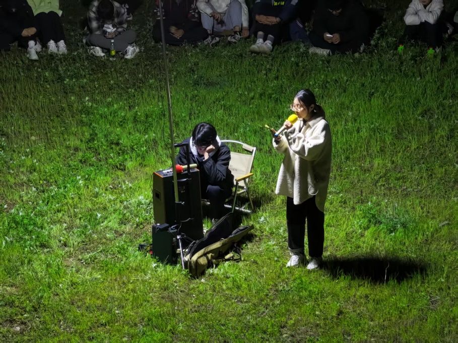 晚饭后,“灯光”晚会正式拉开帷幕。同学们围坐草地,轮番献上精心准备的歌曲、舞蹈和诗朗诵。动感的舞姿、动听的歌声引来阵阵欢呼,掌声与“打call”此起彼伏。一首诗朗诵《go go go出发喽》更是笑翻全场,表演者一本正经的深情演绎与风趣内容形成强烈反差,笑声连连。大家在欢乐中又感动着,当《我和我的祖国》旋律响起,全场起立,高声齐唱,爱国情愫在星空下汩汩流淌。晚会在“开火车”游戏中达到高潮,大家肩搭肩连成一条长长的“火车”,奔跑、跳跃、欢呼,师生共舞的身影在灯光与星辉中交织,定格成草地上最温暖动人的画面。