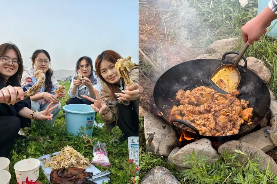 傍晚,山谷落日余辉渐沉,同学们开始动手搭灶、生火、备菜、做饭。石块堆砌的灶台、镁棒点燃的火苗、锅碗瓢盆的碰撞声,一幕幕热火朝天的画面,构成了属于大家的“野炊记忆”。鸡公煲、黄焖鸡、番茄炒蛋、辣椒炒肉等,一道道亲手烹饪的菜肴香气四溢,美味背后,是团队协作与野外生存能力的双重提升,更是青春友谊与幸福感的加倍积累。