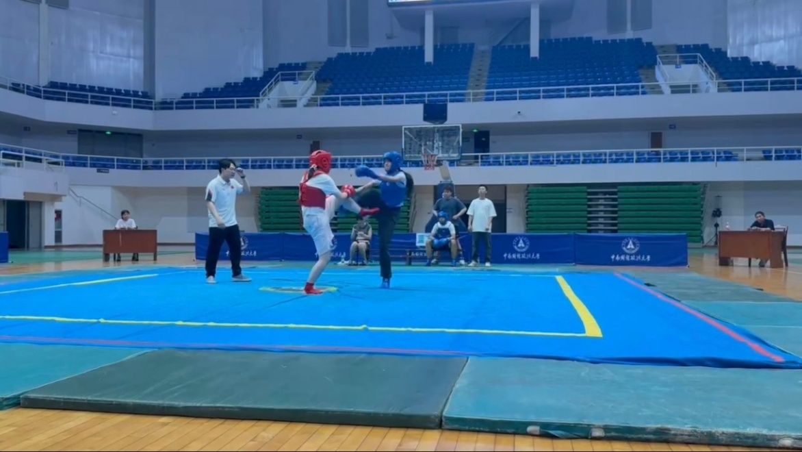 一记青衿意气,震落老将星霜。在男子乙组的比赛中,初次踏上赛场的大一新生胡智尧选手(图中红色方)以2:1的结局击败了队内的老将黄曦(图中蓝色方)。对于胡智尧选手来说,黄曦是经验丰富老将,面对黄曦的强势进攻,胡智尧临危不乱、稳扎稳打、以攻为守、步步为营。经过激烈的比拼,最终夺得胜利。对于黄曦选手来说,大一时他也曾在赛场上夺得荣耀,如今面对大一的师弟,虽然惜败,却在拳锋交错间完成了一场静默的传承。对于他来说,也许自己的侧踹被更加年轻的拳锋破解,不是败北,是武术精神的接力棒稳稳落在了下一程。长江后浪推前浪,武术精神生生不息。