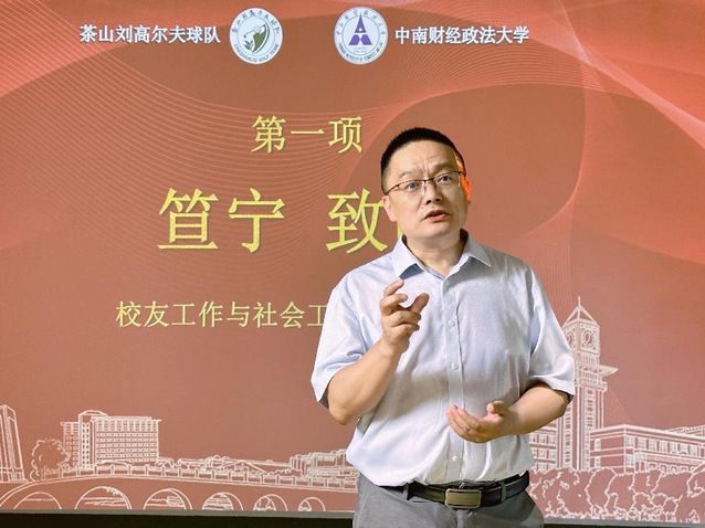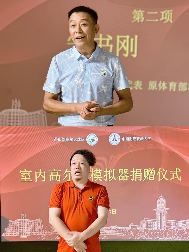 捐赠方代表宋书刚老师深情发言。他回顾了与母校的不解之缘,表达了茶山刘高尔夫球队全体成员心系母校发展、支持体育教育事业的共同心声。此次捐赠,是校友们饮水思源、助力母校培养新时代高素质人才的实际行动。随后,高尔夫湖北运营公司总经理杨总代表运营支持方讲话,介绍了设备的性能特点,并表达了对未来与学校在设备维护、教学支持及高尔夫运动推广方面合作的期待。