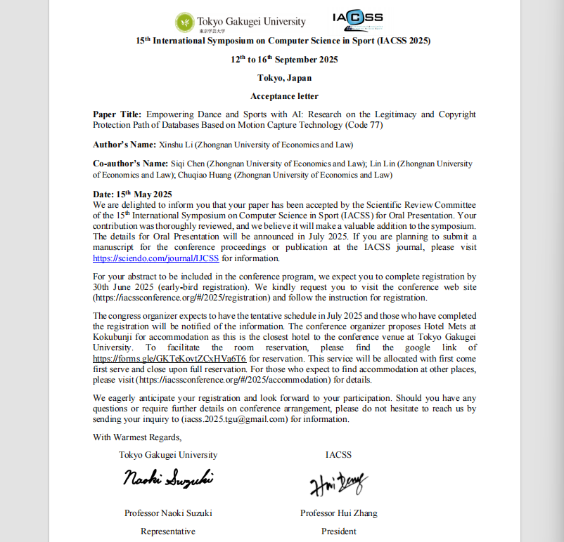 敏锐捕捉前沿动态,她聚焦人工智能与体育科学交叉领域,撰写《Empowering Dance and Sports with AI: Research on the Legitimacy and Copyright Protection Path of Databases Based on Motion Capture》,研究成果被第15届体育计算机科学国际研讨会(IACSS 2025)录用。