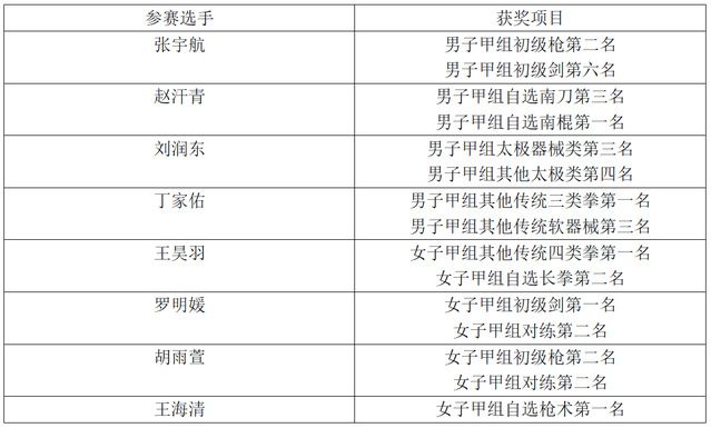 经过两天激烈角逐,我校武术队全体队员稳定发挥、顽强拼搏,在多个单项中取得佳绩,并最终荣获男子组团体总分第三名、女子组团体总分第二名的优异成绩。