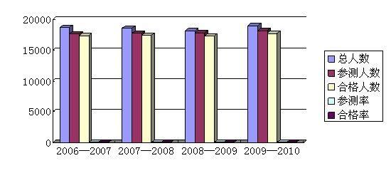 我校自2003年设置了大学生体质测试中心,安排专人每年对大学生进行体质监测,自20032004学年以来,学校及体育部都十分重视学生体质健康测试的实施工作,连续7个学年以来,体质测试中心每学年都按时完成全校本科生的体质测试任务,并按要求及时向国家数据库上传了测试数据,每学年学生体质测试的合格率均在97%以上,达到优秀等级,每学年全校共有四个年级近2万本科生参加体质健康测试,参测率在94%以上。体质测试中心认真组织,积极协调全校的学生参加体质健康测试,力求准确高效地完成每学年的测试工作。以下是20062010学年我校学生体质健康测试的基本情况:
