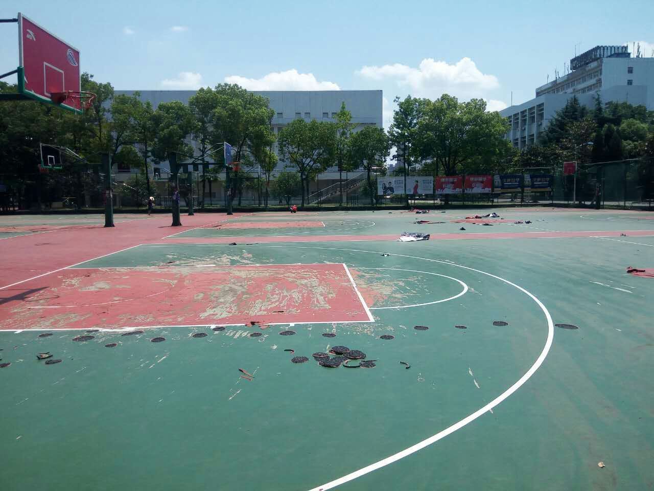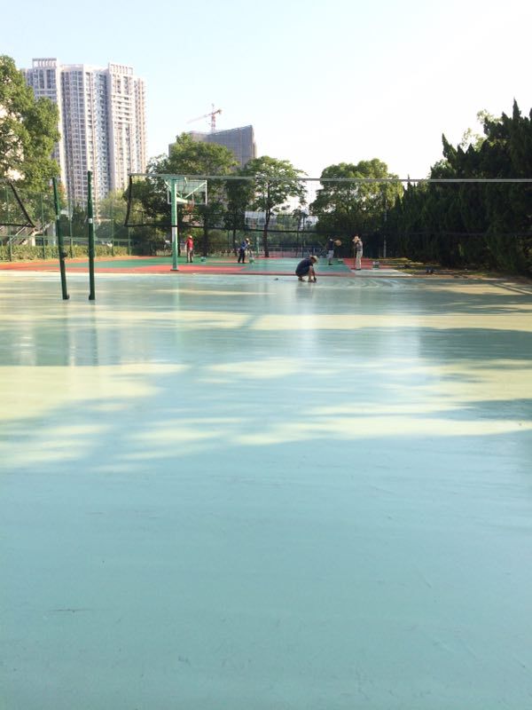 由于暑假期间武汉不断在暴雨和暴晒天气中随意切换,导致修缮工作的难度和工程量极大增加。体育部领导及负责老师顶着烈日和60℃的地面温度与施工单位在现场不断沟通,力求最好、最快地完成场地修缮工作。