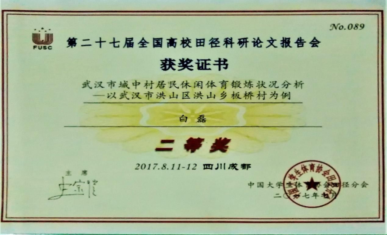 我校教师白磊同志撰写的论文《武汉市城中村居民休闲体育锻炼状况分析----以武汉市洪山区洪山乡板桥村为例》经过专家组评审被作为分会场专题报告,并最终荣获二等奖。