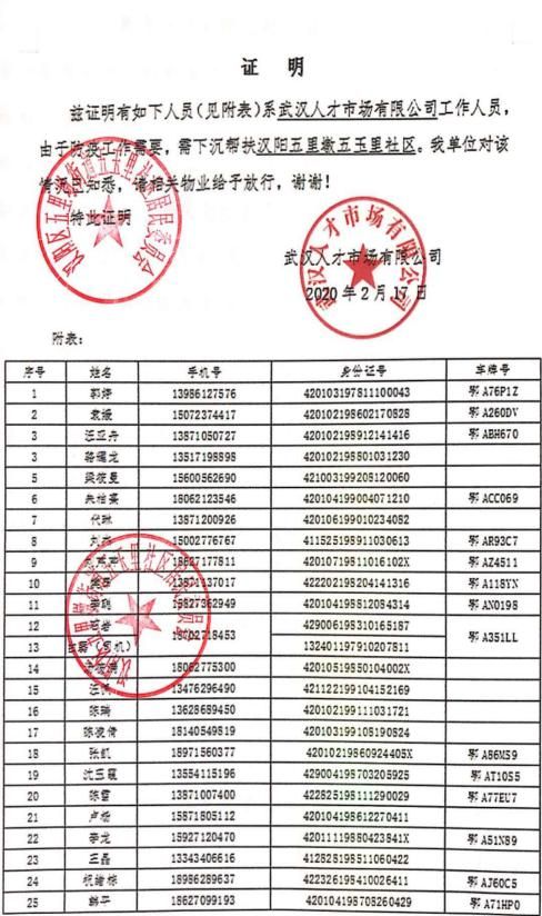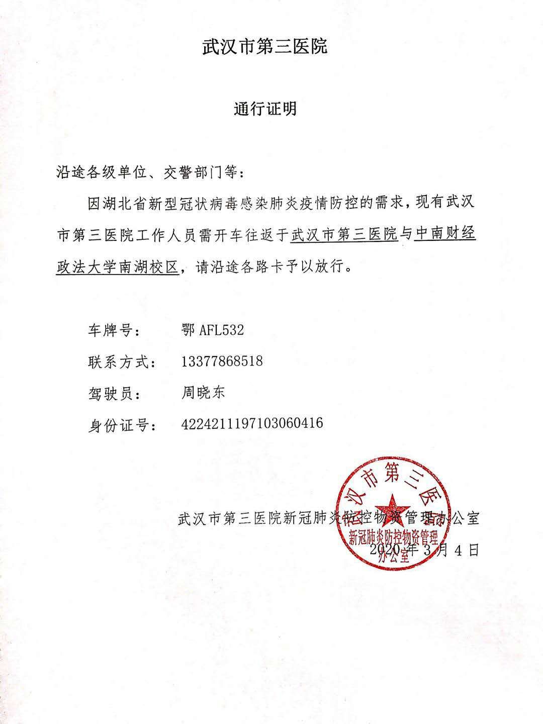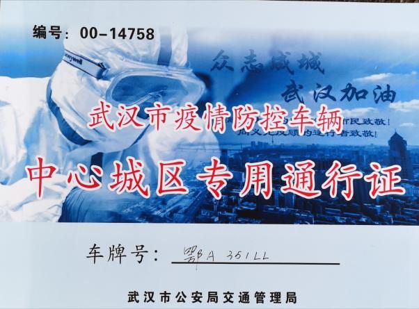 同样,因为交通管制的原因,下沉人员的用车情况也紧张异常。从爱人那里得知此消息后,我告诉她,我们的车子有玛丽亚妇产医院提供的证明材料,可以正常通行,而且我们的车子是辆七座的车,一次性运载更多的人或防疫物品,可以为下沉人员提供用车。在爱人向单位说明情况后,爱人的单位考虑到我家有两个小孩,两位老人,其中岳母一直在医院坚守岗位,我本人负责接送,为了最大限度保证下沉人员的防护安全,就尽量在石岩排班下沉社区时我出车接送,必要时拉载一下消毒防疫物品。武汉人才将我的车辆向武汉市公安局车辆管理局进行了备案,并按要求为我的车辆办理了“武汉市疫情防控车辆中心城区专用通行证”。