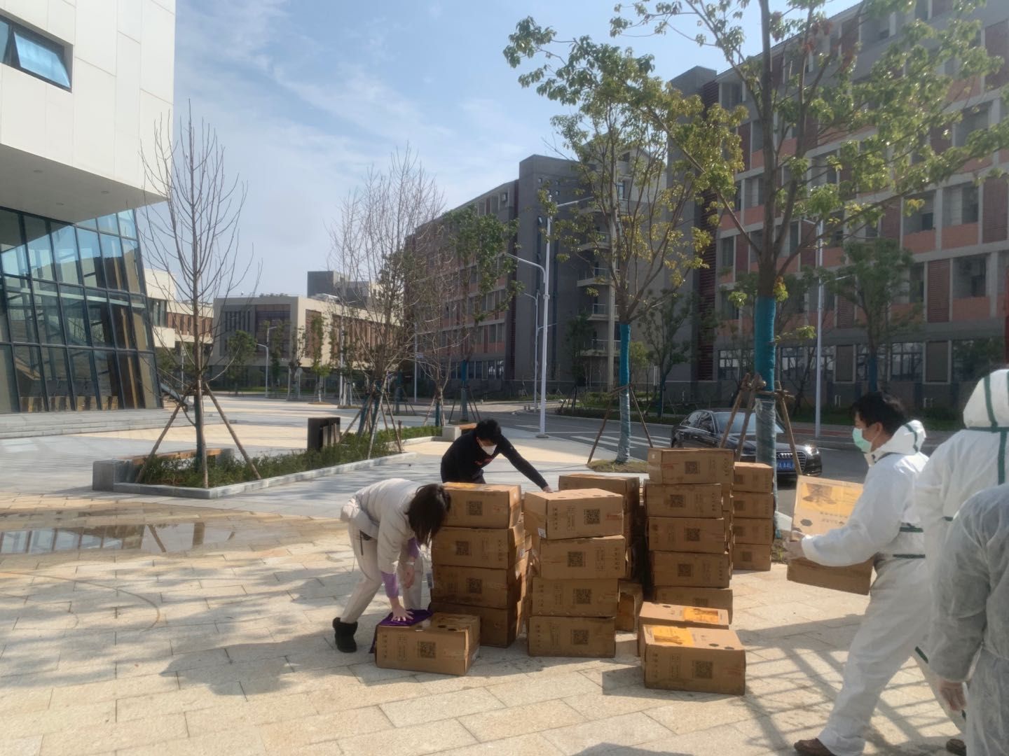 到达未来城校区以后,我第一时间报到并领取任务。妻子的工作是陕西医疗队的联络员和校区疫情防控宣传工作,我的工作是对接校区110监控室;负责校区防疫物资的领用和运输;协助联络员完成各医疗队防疫物资、生活物资、捐赠物资的搬运、清点等后勤保障工作。虽然工作量很大,没日没夜的运输物资、搬运物资、清点物资,可是每当看到医生们拖着疲惫的身体回宿舍休息时,就感觉到我们的辛苦根本不算什么。