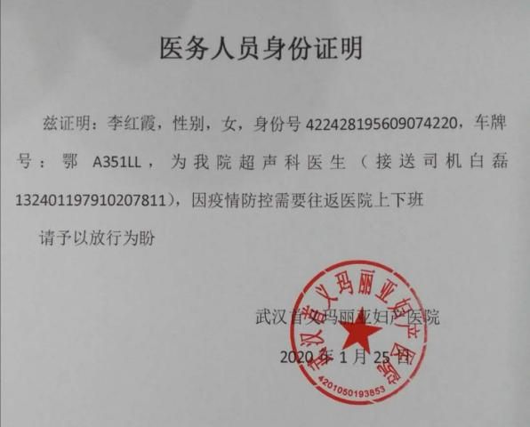 面对新冠肺炎疫情,全市医院根据防疫指挥部的要求,优先集中力量救治新冠患者,在此期间,武汉首义玛丽亚妇产医院收诊了大量的待产孕妇,为了保证这些孕妇的平安,玛丽亚妇产医院全部在汉医护人员都坚守在工作岗位上,其中就包括我的岳母李红霞医生。岳母要坚守工作岗位得到了全家人的一致支持,但因为疫情,武汉市交通管制,医院接送医护人员用车异常紧张,在此情况下,我主动提出可以提供自家车辆接送岳母上下班,同时也可以在排班重合时顺路接送“清江山水——南湖大道——玛丽亚妇产医院”这条线路上的超声科苏主任,为医院减轻用车压力,此举得到玛丽亚医院的高度赞赏,并由其出具了相关的证明材料,保证了车辆在疫情车辆管控期间正常通行。