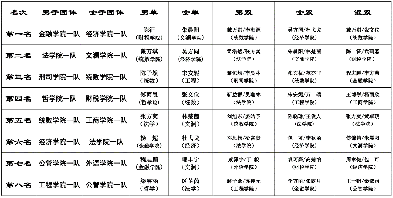 乒乓球比赛成绩表: