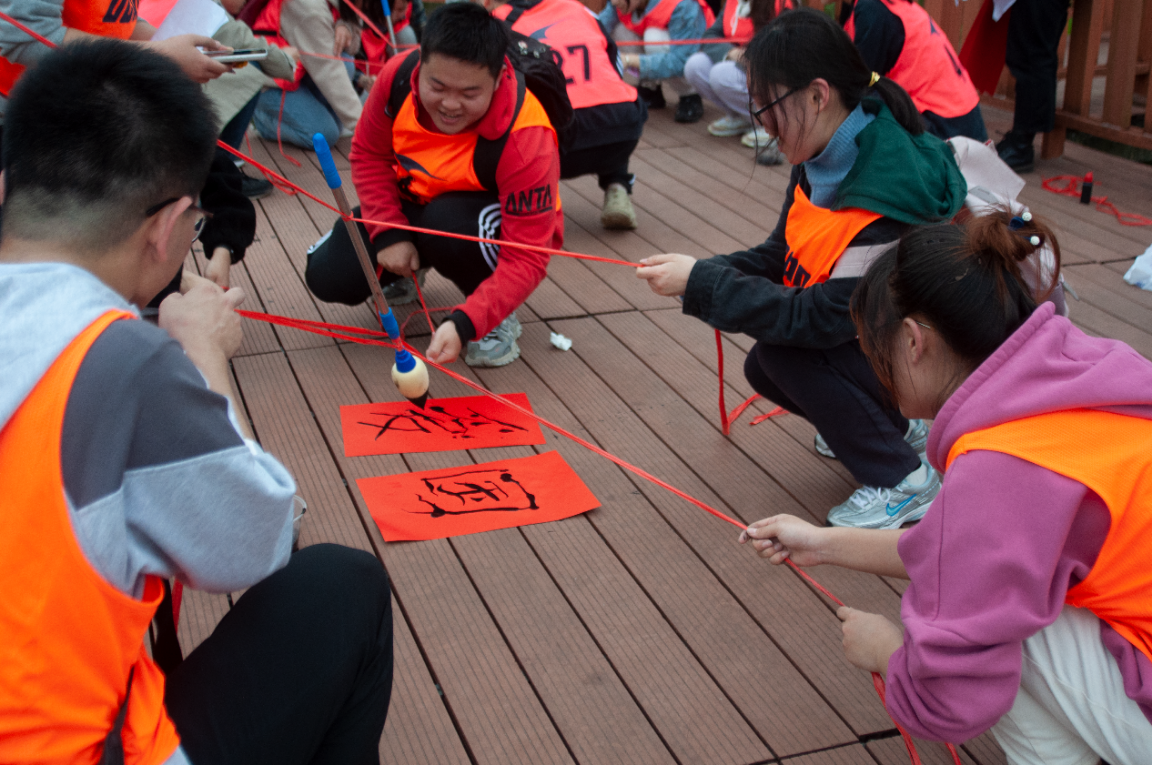 “极速60秒”和 “神笔马良”是令同学们印象最深刻的两个项目。“极速60秒”要求参赛组员在一分钟内根据图片的发生时间完成排序,30张承载着红色记忆的党史图片与30个意义非凡的重要历史节点相交错,掀起了一场场眼力、记忆力、反应力的综合挑战。许多同学表示在这个项目中遇到了瓶颈,尝试了多次才勉强成功,但这次的经历也提醒自己要加强党史学习教育、提高政治核心素养。这正是“户外运动”课想传递给学生的理念,赵光德老师表示:“设计这些项目就是为了让学生更深入地了解我们的党史国史,增进大家的爱党爱国热情。”用一分钟的时间回溯百年党史尚且不易,用一个世纪的时间建设党是何等艰难,“哪有什么岁月静好,不过是有人替你负重前行”。“神笔马良”要求组员用特质毛笔合力完成抽签到的社会主义核心价值观内容的书写,每个组员各执一根系在大毛笔上的绳子,全组人“心往一处想,劲往一处使”,在晓南湖边伏地书写。