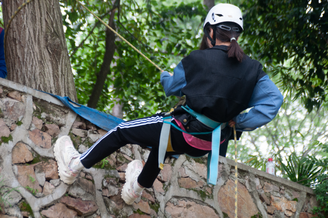 本届户外运动课堂技能体验赛包括十个活动项目,主要以团队跑步、定向识图的形式展开,“户外运动”课堂教学班上的150名学生分为18个小组进行比拼。“岩降”、“走扁带”、“绳结”、“钻木取火”直接考察了学生对户外生存技能的掌握情况。在专业助教老师和安全绳索的保护下,同学们学以致用,“飞檐走壁”,凭借矫健的身姿纷纷顺利打卡。“蒙眼搭帐篷”、“穿越A4纸”、“鼓动人心”、“盲人方阵”充分显现出团队配合的重要性,网媒1901班的虢新汝同学在赛后总结:“信任和默契是成功的关键!”