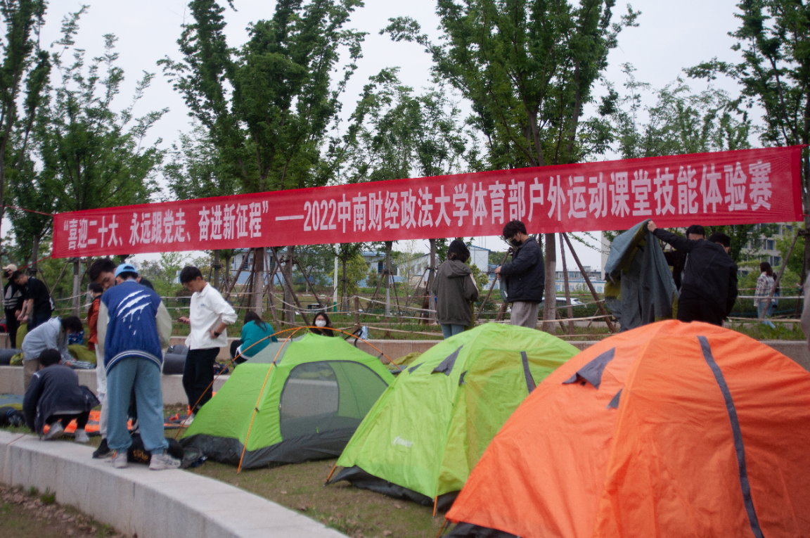 (新闻网讯 学生记者韩悦琰)“酣畅淋漓”、“头脑风暴”,许多同学这样形容户外运动课的结课考核形式。自2018年开设以来,“户外运动”一直是我校最受欢迎的通选课之一,该课程包括理论讲授和户外实践两部分,主要教授学生基本的户外生存技能。受疫情影响,2022年春季学期户外运动课程的户外教学实践于校内开展,以技能体验赛的形式对学生进行考核。4月16日下午两点,随着发令枪响,由我校体育部主办、“双带头人”支部书记张杰主持的首届户外运动课堂技能体验赛正式开始。本届技能体验赛以“喜迎二十大、永远跟党走、奋进新征程”为主题,旨在让中南大学子在传承红色基因中感受户外运动魅力,在发扬体育精神中提升思想政治素养。