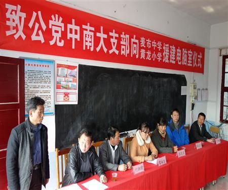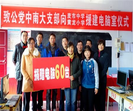 2014年11月22日上午,校致公党支部电脑捐赠仪式在通城县麦市镇麦市中学举行。出席捐赠仪式的有:校党委统战部副部长畅安平、校致公党主委张敬东、副主委冯瑞香以及致公党支部部分党员;麦市镇文教委员雷永生、麦市镇中学校长刘昀、黄龙小学校长何湘赣及麦市镇中学部分师生代表。仪式由麦市镇中学校长刘昀主持。