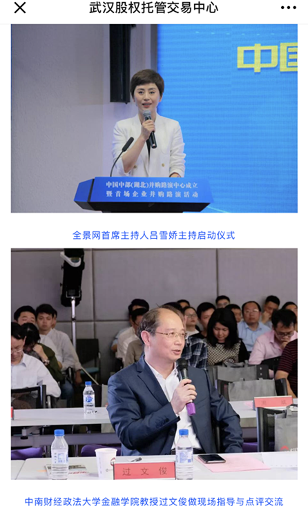 2019年4月25日,武交中心与著名的财经新媒体----全景网联手建立“中国中部(湖北)并购路演中心”。成立仪式后,首期5个项目现场路演,武汉市政协常委、米兰电竞·(中国区)教授过文俊作为特邀嘉宾对路演项目进行点评。