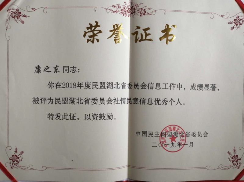 据悉,在今年1月召开的民盟湖北省第十三届委员会第四次全体(扩大)会议上,民盟省委会对2018年度思想宣传、组织建设、参政议政和社会服务工作先进集体和先进个人进行了表彰。我校民盟委员会被民盟省委会授予“参政议政调研工作先进集体”,校民盟康之东老师被评为“民盟省委会社情民意信息先进个人”。