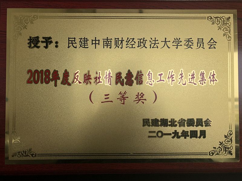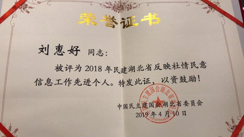 近日,民建湖北省委员会表彰了2018年度优秀社情民意信息、反映社情民意信息工作先进单位和先进个人。我校民建委员会荣获“反映社情民意信息工作先进单位三等奖”(全省共16个单位获此表彰),校民建会员刘惠好教授荣获“反映社情民意信息工作先进个人”(全省共16名个人获此表彰),其中刘惠好教授的“全国两会期间金融问题相关建议”获优秀社情民意篇目。