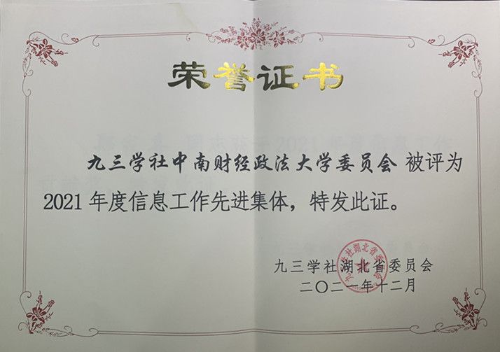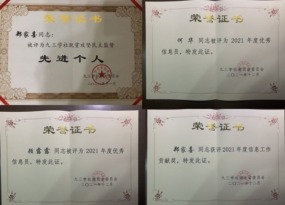 (通讯员 顾露露)近日,九三学社中央委员会和九三学社湖北省委员会对参政议政先进集体和先进个人进行了表彰,我校九三学社委员会荣获集体和个人多项表彰。校九三学社委员会荣获2021年度湖北省信息工作先进集体;郑家喜教授分别荣获九三学社中央2016-2020年脱贫攻坚民主监督先进个人称号、九三学社中央2018-2020年参政议政先进个人、2021年度九三学社中央信息工作贡献奖、2021年度九三学社湖北省信息工作贡献奖;顾露露教授、何华教授分别荣获2021年度九三学社湖北省优秀信息员称号。在庆祝建党百年和“十四五”规划开局之年,校九三学社委员会深入学习贯彻习近平总书记系列重要讲话精神,充分利用自身专业优势,积极参政议政、建言建策,为学校的统战工作争得了荣誉。