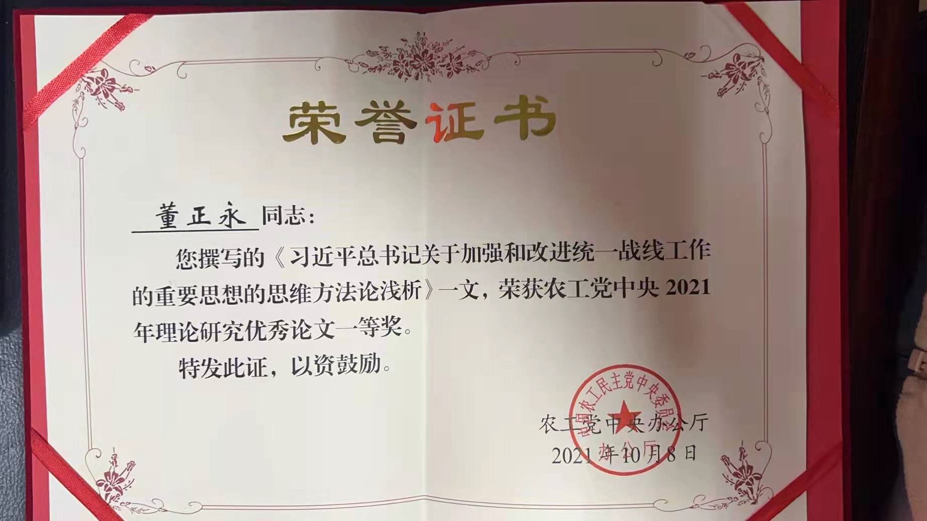 近日,农工党中央2021年理论研究优秀论文评选结果揭晓,共评选出理论研究优秀论文435篇。其中,一等奖60篇,二等奖120篇,三等奖255篇。我校农工民主党党员、马克思主义学院朱书刚教授、党委统战部董正永老师撰写的《习近平总书记关于加强和改进统一战线工作的重要思想的思维方法论浅析》一文,荣获农工党中央2021年理论研究优秀论文一等奖。