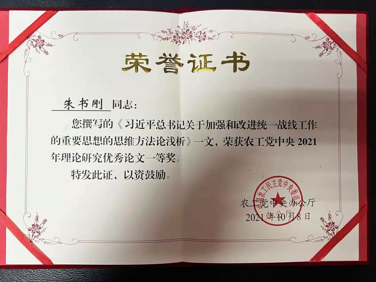近日,农工党中央2021年理论研究优秀论文评选结果揭晓,共评选出理论研究优秀论文435篇。其中,一等奖60篇,二等奖120篇,三等奖255篇。我校农工民主党党员、马克思主义学院朱书刚教授、党委统战部董正永老师撰写的《习近平总书记关于加强和改进统一战线工作的重要思想的思维方法论浅析》一文,荣获农工党中央2021年理论研究优秀论文一等奖。
