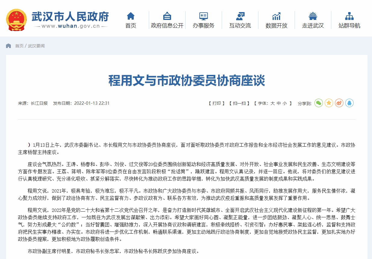 (根据《人民政协报》2022-01-15 第一版、《长江日报》2022-01-14 第一版、人民网2022-01-13、武汉广播电视台2022-01-13、人民政协网2022-01-14等媒体报道采编)