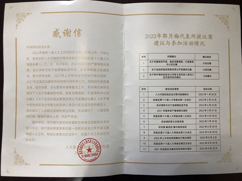 胡太荣感谢学校多年来给予武昌区人大工作的大力支持,感谢学校为武昌区地方经济社会发展中发挥的重要作用,希望今后继续给予武昌区各个方面工作更多智力支持。同时对郭月梅教授任职武昌区人大常委会委员期间认真履职和高度负责的专业态度给予高度评价,并向学校致以感谢信,感谢学校对郭月梅教授人大履职工作给予的大力支持和关心,希望郭月梅教授再接再厉继续做好人大常委会委员今后的工作。
