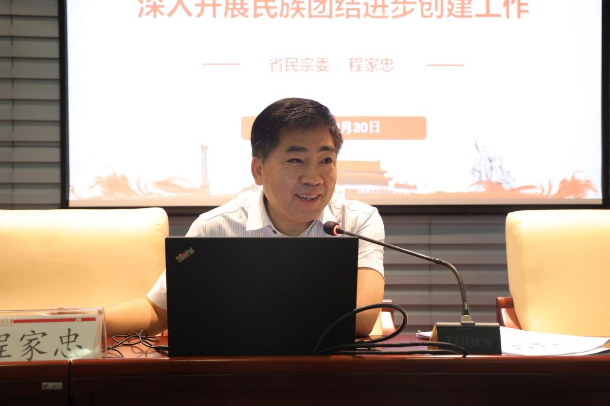 程家忠以“如何做好高校铸牢中华民族共同体意识教育”为主题,解读了第五次中央民族工作会议的主要内容,强调高校要深刻领会习近平总书记关于加强和改进民族工作的重要思想,以“十二个必须”为新时代党的民族工作的根本遵循,把铸牢中华民族共同体意识作为新时代党的民族工作的主线,正确认识铸牢中华民族共同体意识的重大意义。指出高校要结合民族团结进步创建抓好铸牢中华民族共同体意识教育:一是高校党委要履行民族工作主体责任,落实两个纳入;二是要做到铸牢中华民族共同体意识教育全覆盖,构建宣传教育常态化机制;三是建设各族师生的中华民族共有的精神家园;四是促进各民族交往交流交融;五是为民族团结进步事业作贡献。最后,他建议高校要在学校党委统一领导下,由统战部牵头协调,形成学院发挥关键作用、各部门通力合作、全校师生共同参与的工作格局,认真做好新时代高校民族工作。