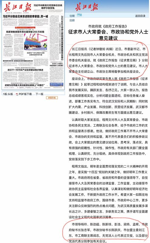 (长江日报 2022年12月23日)近日,武汉市委副书记、市长程用文先后到市人大常委会机关、市政协机关和民主党派市委会机关座谈,就《政府工作报告(征求意见稿)》分别征求市人大常委会、市政协和党外人士的意见建议。市人大常委会主任胡立山、市政协主席杨智参加相关座谈会。