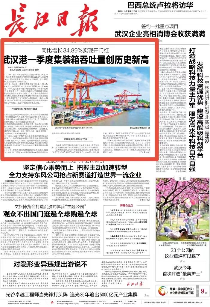 (长江日报 4月12日)4月10日,长江日报记者从武汉交通局等部门获悉,一季度,武汉港累计完成港口货物吞吐量3222万吨,同比增长5.16%。其中集装箱吞吐量65.87万标箱,同比增长34.89%,创历史新高,实现开门红。