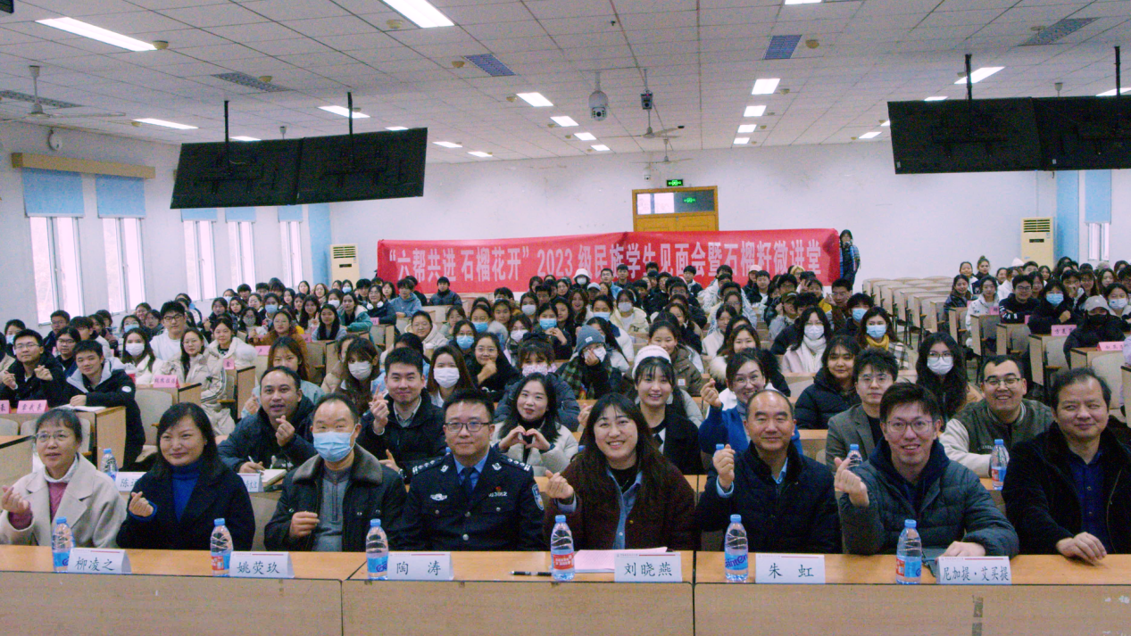 (学生通讯员 周冰莹 茹菲娜 摄影 郑宇珊)为深入学习贯彻习近平总书记关于加强和改进民族工作的重要思想,引导各民族学生铸牢中华民族共同体意识,扎实做好我校边疆地区各民族学生铸牢中华民族共同体意识教育和安全教育,促进各民族师生交往交流交融,12月14日下午,我校“六帮共进 石榴花开”2023级边疆地区学生见面会暨石榴籽微讲堂和“迎冬至 聚浓情”民族团结一家亲主题实践活动分别在在首义校区文泽楼303教室和在首义校区黄鹤园餐厅举行。活动邀请武汉市公安局国保支队文保大队东新工作站站长陶涛开展主题讲座,保卫部副部长姚荧玖,首义校区党校校长、党委学生工作部五级职员朱虹,校团委副书记(兼)、工商管理学院辅导员尼加提·艾买提,教务部七级职员柳凌之,学工部工作人员、相关学院辅导员代表以及南湖校区边疆地区民族学生近300人参加活动。活动由党委学生工作部副部长刘晓燕主持。