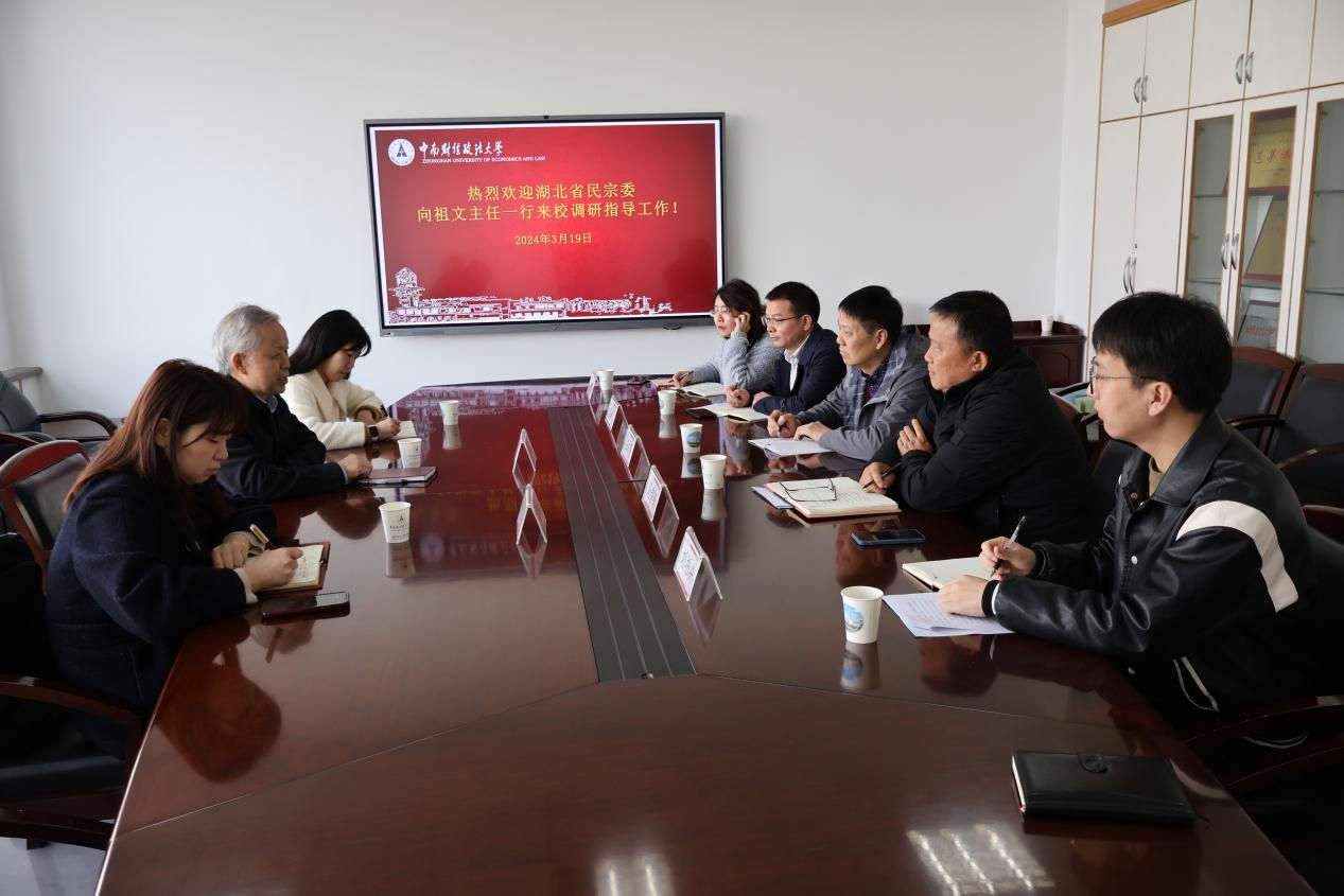 3月19日上午,湖北省民宗委办公室主任向祖文、副主任尹秦玲一行来学校调研座谈。校社会科学研究院、马克思主义学院教授,铸牢中华民族共同体意识研究中心主任王文贵,党委统战部部长高碧峰,党委学生工作部副部长范献龙,《中华民族共同体意识教育概论》授课教师、新闻与传播学院教授吕宗瑛,美美中南民族团结教育工作室助理主持人、工商管理学院辅导员刘振兴参与座谈。座谈会由高碧峰主持。
