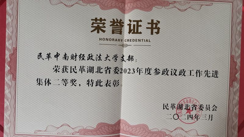 本次表彰中,民革中南大支部荣获2023年度民革省委会参政议政工作先进集体二等奖,先进个人二等奖1项,三等奖2项;荣获民革省委会反映社情民意信息工作先进集体三等奖,先进个人特等奖1项、一等奖1项。