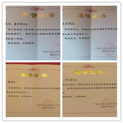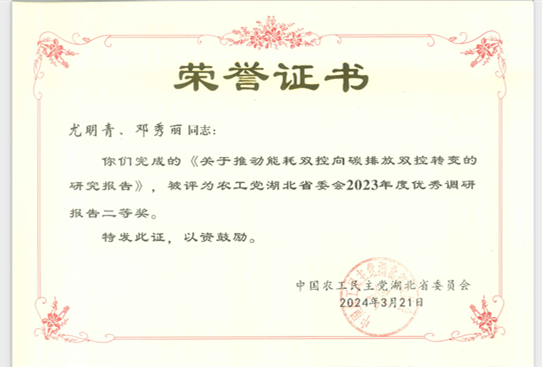 会上,我校代高洁老师完成的《关于进一步优化武汉市知识产权服务体系建设的建议》被评为2023年度优秀调研报告一等奖,尤明青老师完成的《关于推动能耗双控向碳排放双控转变的研究报告》被评为2023年度优秀调研报告二等奖,何雄老师完成的《促进大城市托育服务高质量发展的对策建议》被评为2023年度优秀调研报告三等奖。代高洁、何雄被评为2023年参政议政工作先进个人,尤明青被聘为湖北省统战理论研究创新联盟特邀研究员。