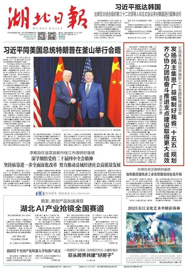 10月30日,中共湖北省委召开党外人士专题协商座谈会,深入学习贯彻习近平总书记在中共二十届四中全会上的重要讲话精神,就编制好我省“十五五”规划建议听取各民主党派省委会、省工商联负责人和无党派人士代表的意见建议。省委书记、省人大常委会主任、省“十五五”规划起草组组长王忠林主持会议并讲话。