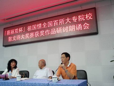 颁奖典礼之前(9月11日),与会代表举行了“蔡丽双杯”祖国情全国百所大专院校散文诗大奖赛获奖作品研讨朗诵会。我校新闻与文化传播学院院长胡德才教授、古远清教授应邀参加了研讨朗诵会和颁奖典礼。
