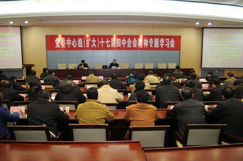 ![]() 11月18日,校党委中心学习组举行专题学习会,继续深入学习党的十七届四中全会精神。本次学习范围扩大到学校全体党委委员、学校各二级党组织负责人。学习会由校党委副书记杨志光同志主持。