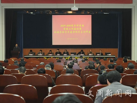 新闻网讯(通讯员 周苏展) 23日上午,学校召开了“2009—2010学年下学期学校工作会议暨校领导班子年度考核民主测评会”,全体校领导,校党委委员,校纪委委员,各二级单位党政负责人,校学术委员会主席,校工会、教代会负责人,各级人大代表、政协委员、政府参事,各民主党派校主委,校侨联主席,离退休人员党总支书记、老年人协会会长、自修学院院长,武汉学院党政主要负责人,校研究生会主席和校学生会主席等出席了会议。
