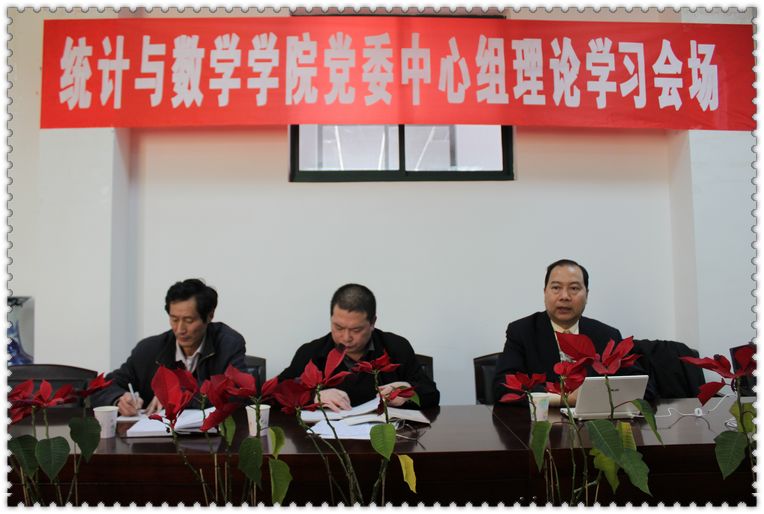 新闻网讯(通讯员 白玉)12月9日下午,统计与数学学院党委中心组第五次理论学习在学院四楼会议室举行。本期理论学习由校党委徐敦楷书记主讲,学院全体党委委员以及各系系主任、系副主任、教职工党支部书记和部分教师代表参加了本次学习。