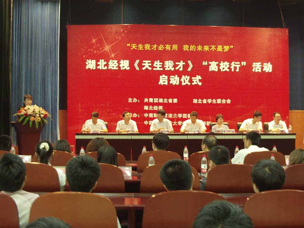 新闻网讯(学生记者 张坤 王蕾 李延权 油志怀)5月15日上午10时,由共青团湖北省委、湖北省学生联合会、湖北经视联手主办,我校团委及工商管理学院南湖人才开发公司承办、以“天生我才必有用,我来搭桥你行动,你的职场不是梦”为主题的《天生我才》“高校行”活动启动仪式在文泉报告厅拉开帷幕。