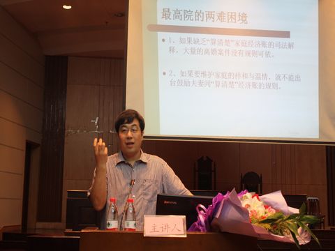 讲座开始后,俞教授首先为大家解读了《婚姻法》司法解释(三)的相关内容,并提出其论点——现行《婚姻法》及相关司法解释忽视了中国传统家的观念及构成,而过于强调确认夫妻财产权属或分割,使《婚姻法》向如何清算经济账倾斜了,因而对家庭的和谐十分不利,进而提出“《婚姻法》司法解释(三)真的把中国人惹急了?”这一问题。接着俞江教授指出,随着时代的发展,粗糙的婚姻法已无法解决新出现的婚姻问题,而新的《婚姻法》及司法解释使最高院面临着两难境地:第一,如果缺乏“算清楚”的司法解释,大量离婚案件则无规则可依;第二,如果要维护家庭的和谐与温情,就不能出台鼓励夫妻间“算清楚”经济账的规则。在此基础上,俞教授分析造成这一困境的原因是由于现行《婚姻法》存在框架性失误,即用孤立的《婚姻法》取代家庭关系,由此导致了用婚姻关系消解其他家庭关系,用夫妻财产制度替代整体性的家产制制度。基于这一问题,俞江教授为同学们简要分析了美国人与中国人的家庭观,指出重视家庭这一观念是没有古今中外之分的。围绕此问题,俞教授简要分析中国家庭传统,指出其必不可少的两个特点:整体性的家以及整体性的家产。基于对前面问题的分析,俞江教授反思《婚姻法》,认为其将家庭简化为婚姻财产这一范畴,而取消了父母在成年子女家庭中的法律地位以及忽视了夫妻间的谦让美德,取消了家产的存在。最后,俞江教授对此问题提出了自己的看法,认为中国亟宜制定一部《家庭法》,以承认老年父母在家庭中的基本地位,承认整体性的家的存在以及设立家产制度。