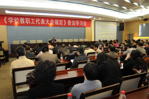 中国宪法学研究会常务理事、湖北省法学会地方立法研究会副会长王广辉教授作了题为《教代会是教职工民主管理的基本形式》的精彩讲解报告。他首先结合我国国家性质和《中华人民共和国宪法》,强调教代会是社会主义民主的表现形式,其制度属社会民主范畴,是学校民主管理的具体形式;然后,结合《中华人民共和国高等教育法》和《国家中长期教育发展规划纲要(2010—2020年)》指出教代会是我国大学制度的主要组成部分,教代会的民主管理和监督与党委的政治领导、校长的行政执行和学术委员会的专业治学一起,共同构成了我国高校的内部权力体系,是实现大学“善治”目标的重要支柱之一。王广辉教授详细讲解了从《高等学校教职工代表大会暂行条例》到国务院部门《规定》,教代会制度的发展完善进程和教代会制度的基本内容,并且就学校进一步发挥教代会民主管理作用给出了建议。