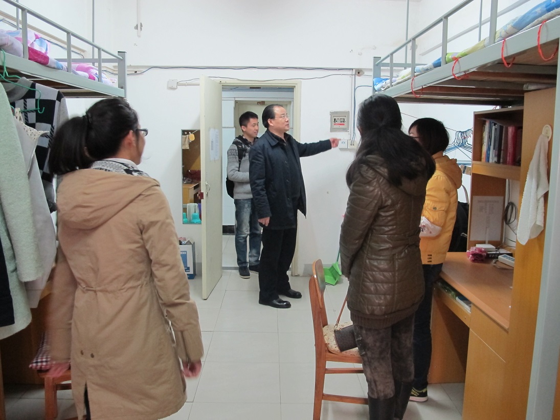 检查过程中,江克宁书记和梁艳艳老师对研究生宿舍用电安全、卫生环境、床铺整洁等进行了认真地检查,重点查看了宿舍线路是否存在老化、是否有使用电热毯等违规电器、门窗是否完好无损等情况。江克宁反复叮嘱同学们要注意用电安全,强调使用违规电器的危害,要求同学们遵守学校规章制度,不使用违规电器,做到防患于未然。江克宁还教导同学们从个人做起,培养良好的生活习惯和细节,平时注重个人卫生,注重公共卫生环境建设,确保学院研究生在安全、卫生、健康等方面不出问题,真正实现以生为本,以生为重。他们对物品摆放整齐、地面干净、宿舍通风做得好的17栋213等宿舍予以表扬。对个别卫生环境不达标的宿舍,提出了改进建议。江克宁还要求研究生会干部及时登记学生宿舍的家具坏损、日光灯不亮、水龙头渗水、天花板漏水等情况,以便学院统一向学校相关部门反映,使这些问题及时得到解决,争取为同学们创造一个良好的学习、生活环境。
