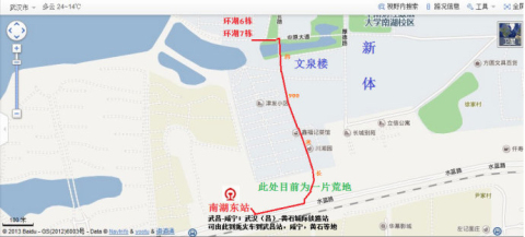 通过环湖公寓和文泉楼间的桥(白水桥),向津发小区方向走,穿越津发小区,来到一扇铁门前,通过铁门来到一小片荒地,通过此荒地后,向右走,可发现南湖东站。整个路程约900米。