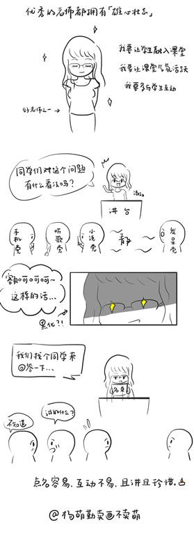 点评: 教务部:有资料表明,课堂师生积极互动,同学对知识点的理解、掌握程度显著提高。“教师授、学生受”的灌输式教法、学法早就成为需要改进的教学方法。小一点说,师生互动是促进师生平等交流、课堂气氛和谐的有效途径。往大一点说,师生互动是教学相长、避免出现职业窘境的利器。