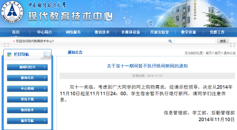 11月10日,中南大相关部门在官网发出“关于双十一期间暂不执行晚间断网的通知”,并在结尾处温馨提示“请同学们注意休息”。该通知一经发出,立刻引爆了中南大的空间、朋友圈、微博,很多同学表示“学校真是越来越给力了,不刷夜抢购都对不起学校啊”。这个双十一因为有了学校的“技术支持”,空前地火爆,一场没有硝烟的战争似乎一触即发。