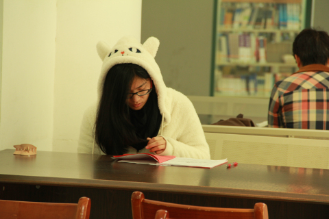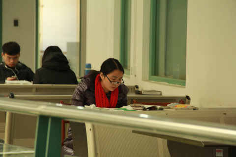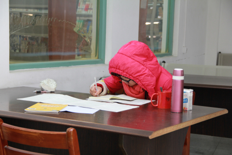来自统计与数学学院的张怡姝捧着复习资料,时而在椅子旁来回踱步,时而蹲在椅子旁。为了能开口读而不吵到他人,她选择呆在阅览室外。为了抵御这慑人的寒冷,她选择往水瓶里倒满热水,不时地握一握它,暖和暖和因为捧书而冻到发白的手。“不到最后一刻,不会放弃”简单却又不平凡的字眼,正是她的考研态度。