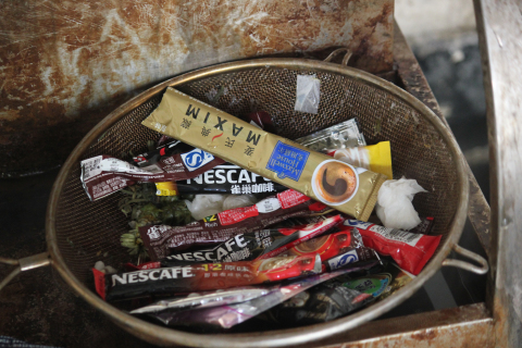 一杯咖啡,冲走的是疲惫,留下的是考研人追求梦想时的不遗余力,开水机旁的咖啡袋见证属于考验人的努力。