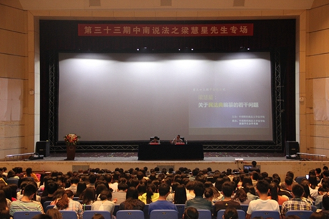 2015年5月8日,南湖会堂又迎来了一位重量级法学专家——中国社会科学院学部委员、博士生导师梁慧星教授。他为同学们讲解关于民法典编纂的若干问题,提出“要编纂一部进步的、完善的、民主的民法典,作为整个民族的教科书”,偌大的南湖会堂座无虚席。