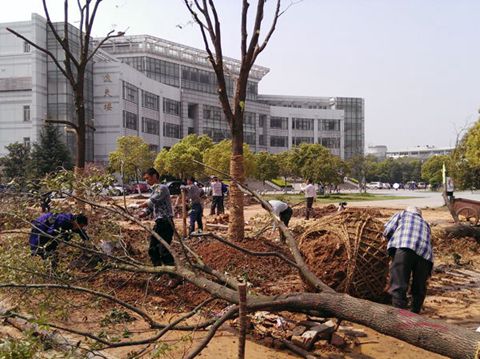 南湖校区的土壤也是学校绿化工作的一大难题。南湖校区的土壤是观音土,土质比较板结,不利于树木的茂盛生长,逸夫图书馆北广场栽植的树苗便是由于观音土的土质问题,在栽植后的好几年都没有长大。要想使校园树木成林成片,必须有针对性地进行换土工作。说干就干,绿化中心的工作人员开始挖深坑,将观音土挖出后运走,填进利于树木成长的土壤。在较为肥沃土壤的培育下,南湖校区绿意越发盎然。